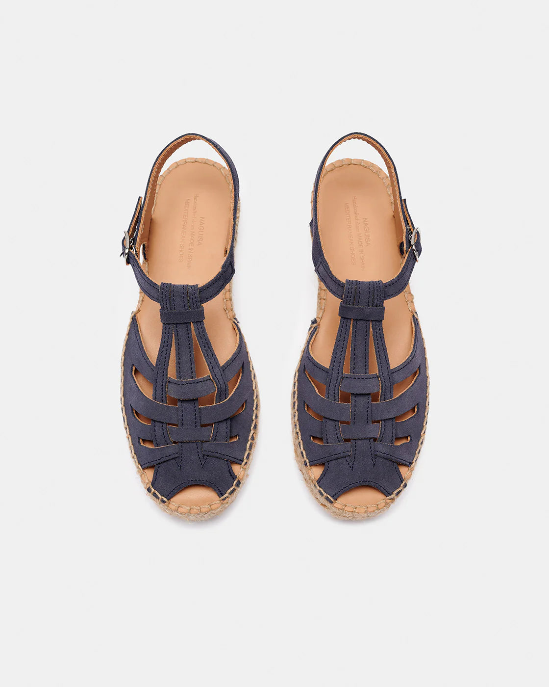 Bemol, a Naguisa classic, is T-strap caged sandal with an adjustable ankle strap. Split leather uppers. Leather lining. The insole is cushioned with foam and lined with natural cowhide leather for better breathability. The sole features a jute double braid, a small wedge for improved comfort, and a non-slip rubber outsole. Total height of 5cm.
